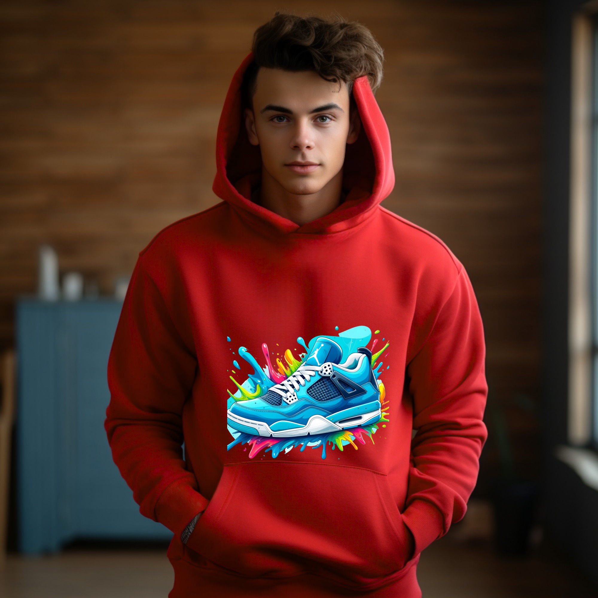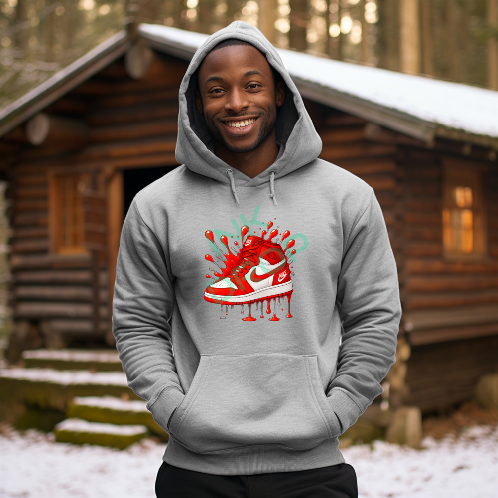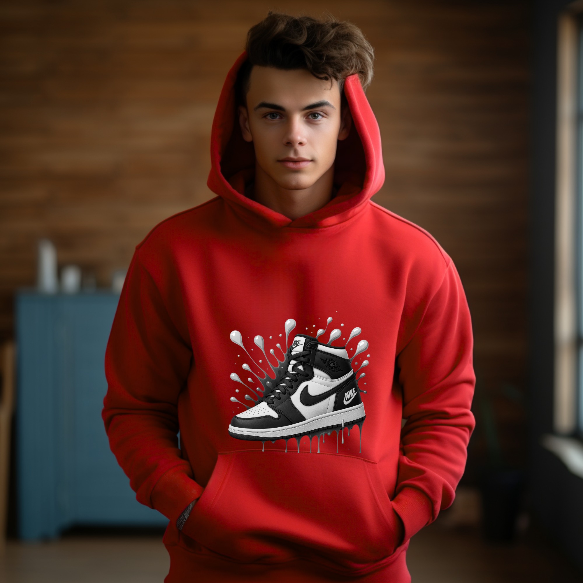 Jordan 1 Art Hoodie, Iconic Sneaker Design, Red White Paint Splash, Urban Streetwear Apparel, Dynamic Shoe Graphic Hoodie