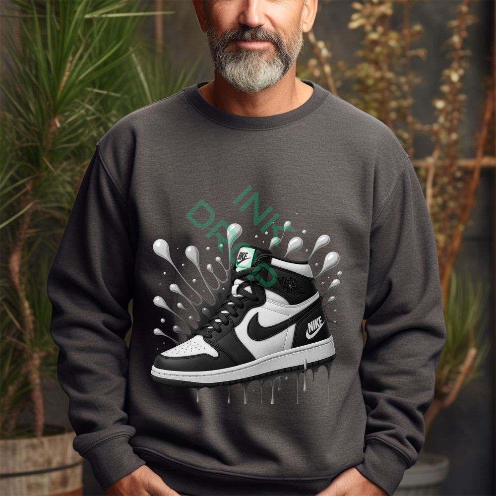 Iconic Sneaker Drip Sweatshirt, Urban Streetwear Art, Black White Shoe Graphic, Liquid Splash Design, Trendy Artistic Apparel, Cool Unisex