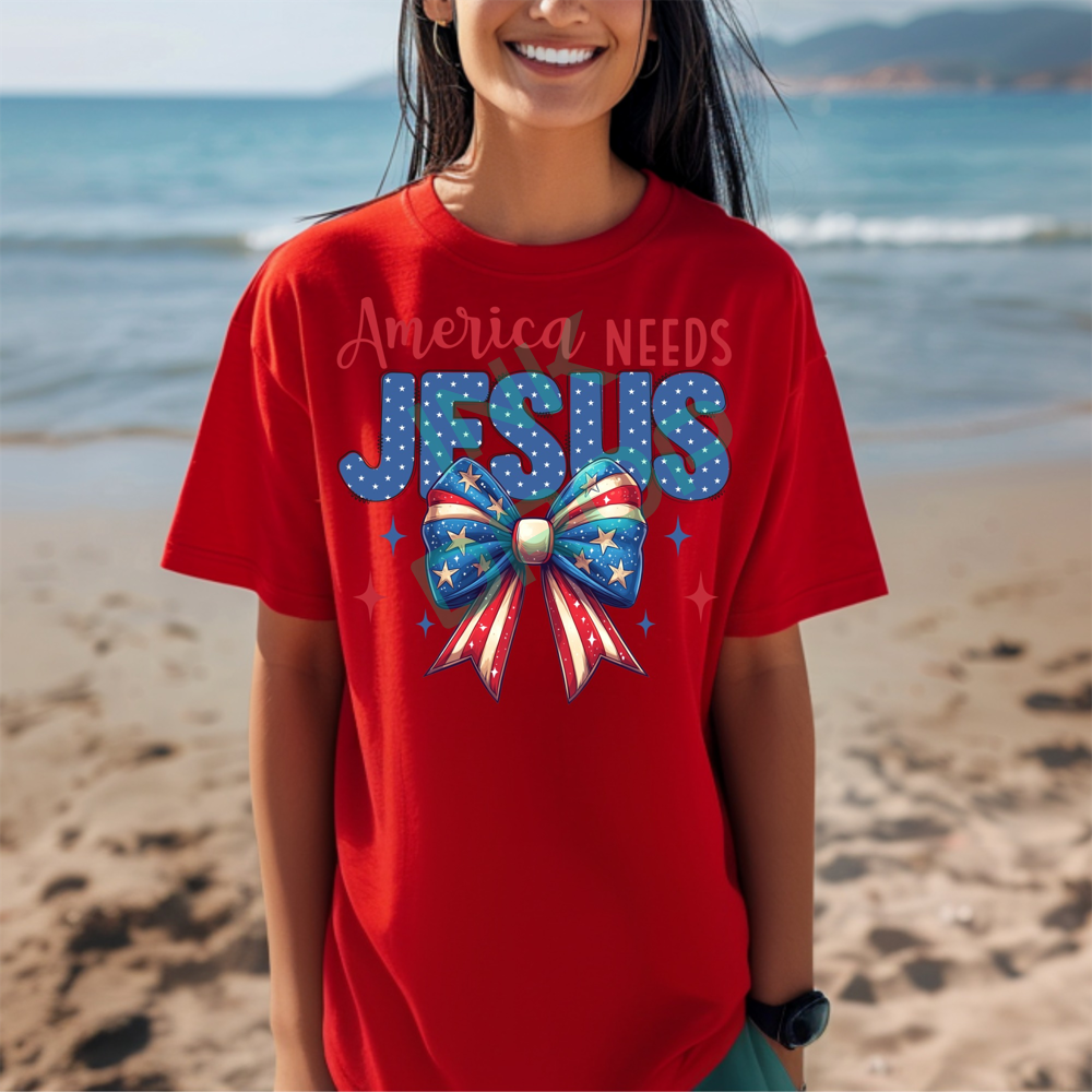 Show your patriotic spirit with this America Needs Jesus T-Shirt! Featuring a red white and blue design with stars and a bow. Get yours today and show your faith!