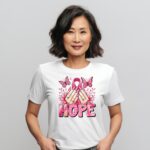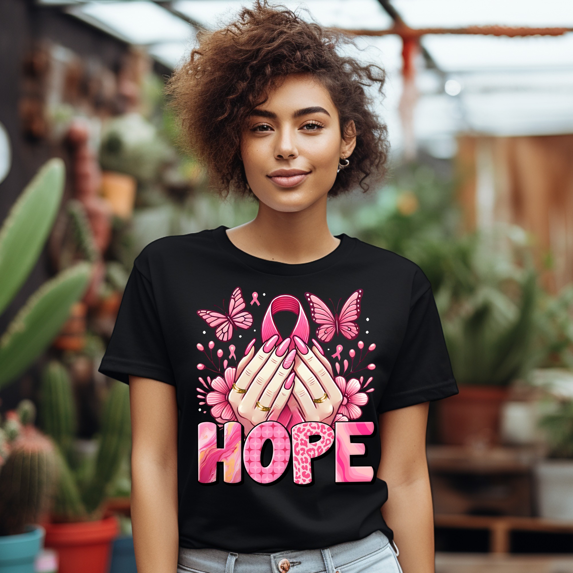 Show your support with this Breast Cancer Awareness design featuring hands holding a pink ribbon butterflies flowers and the word “HOPE”. Perfect for shirts or crafts.