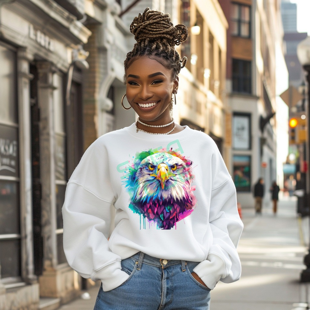 Showcase your style with this unique eagle design! The colorful paint splatters combined with the majestic eagle portrait makes this Sweatshirt a must-have for art and animal lovers.