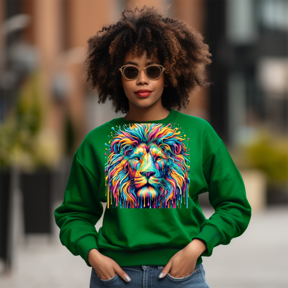 The design features a detailed lion head rendered in a dazzling array of colors, creating a visually striking and modern look. Each color flows seamlessly into the next, giving the impression of paint dripping down the lion’s mane. The vibrant hues and dynamic composition make this sweatshirt a true work of art.