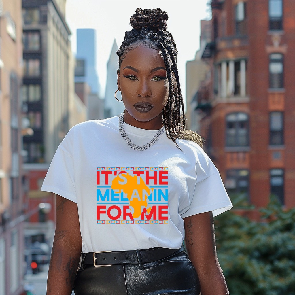 Show your pride with this awesome T-Shirt! Featuring a vibrant design with the words “It’s the melanin for me” and a stylized Africa map. Great way to express yourself!