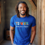 Show your appreciation with this fun Teacher T-Shirt design featuring ruler paper pencil apple and books. It says Teach Love Inspire at the bottom. Get yours today!