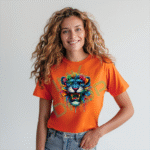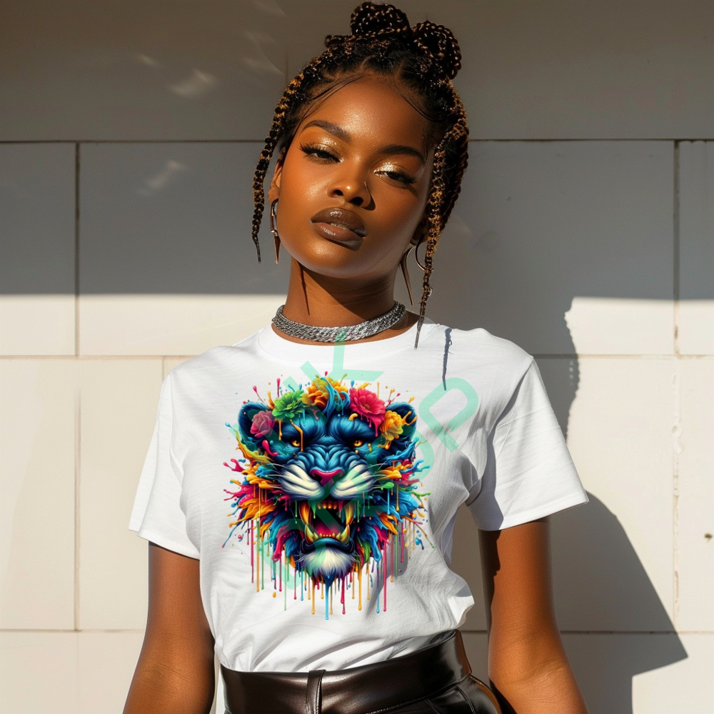 Show off your unique style with this tiger art inspired T-Shirt. Perfect for any occasion grab yours now! It features colorful flowers around the face and a vibrant design.