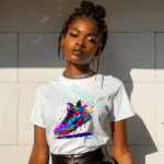 This T-Shirt features a vibrant athletic sneaker design with dripping colors, capturing the essence of vivid street art. Perfect for casual wear or making a bold statement.