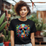 Stand out with a vibrant skull artwork T-shirt featuring a colorful and artistic design. Perfect for those who love unique and eye-catching fashion statements.