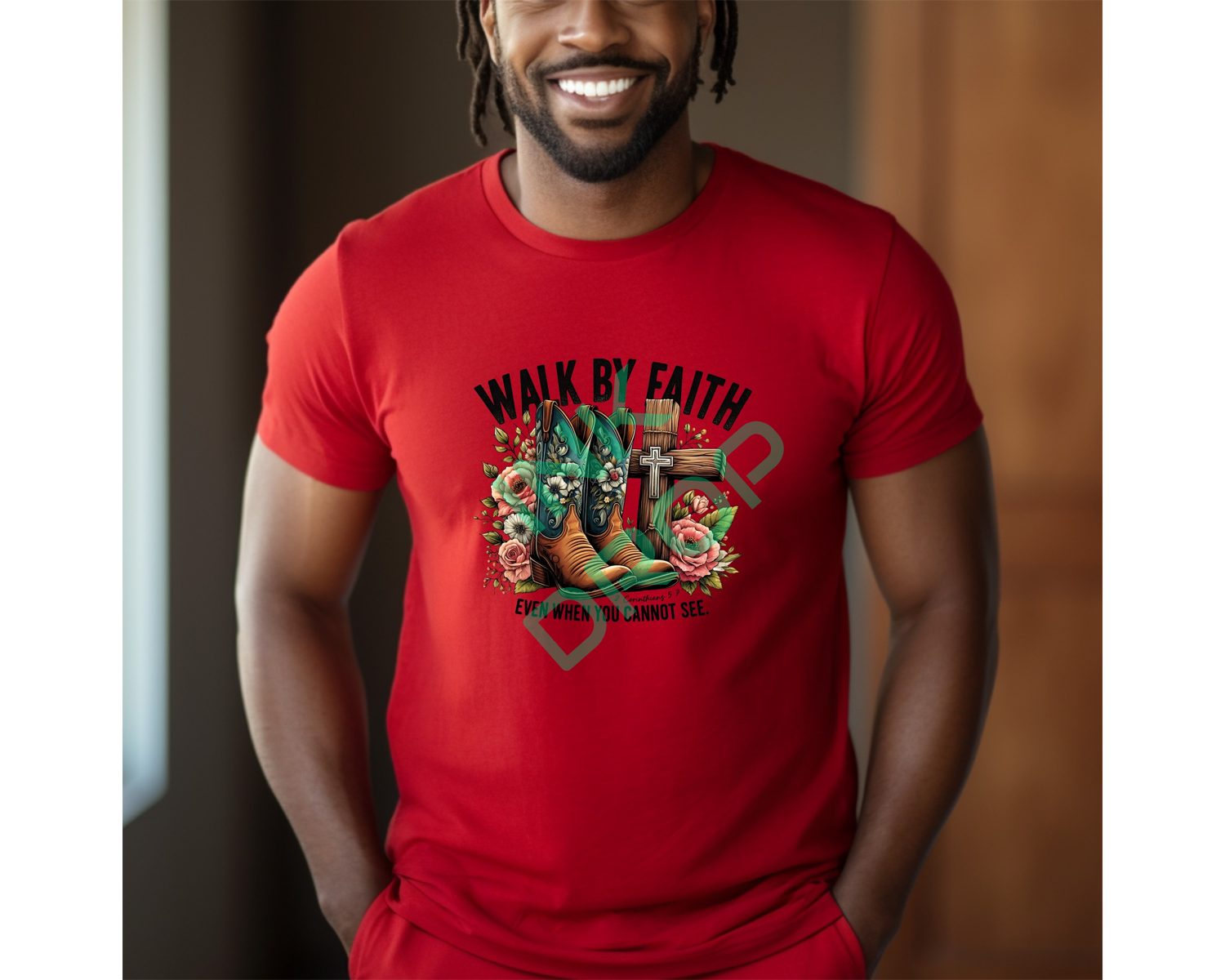 Embrace faith with this unique T-Shirt featuring cowboy boots and a cross. Inspired by 2 Corinthians 5:7 this design is perfect for expressing your love for God.