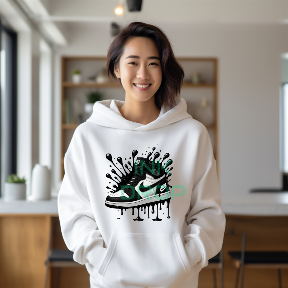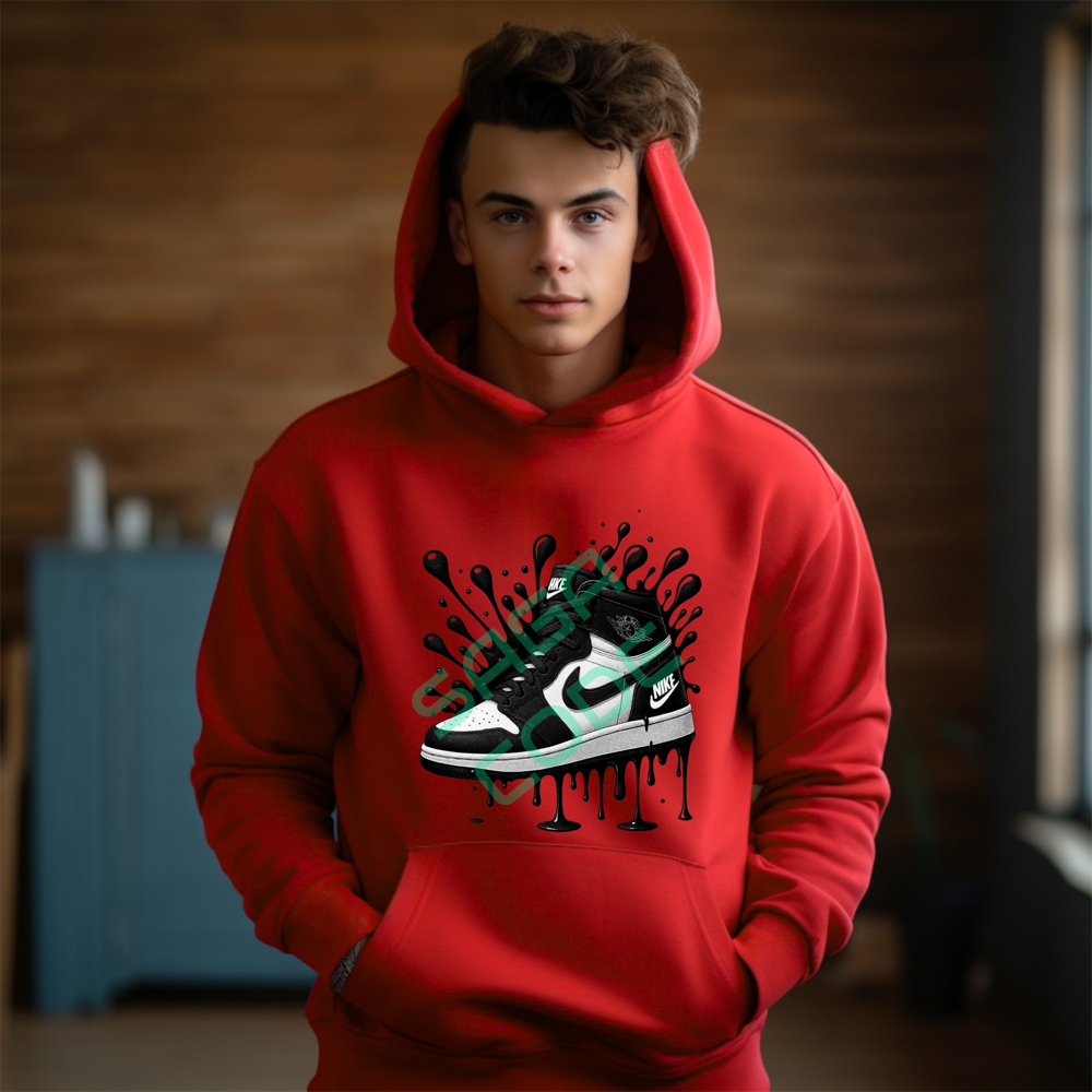 Black White Sneaker Drip Art Hoodie, Urban Streetwear Kicks Design, Artistic Paint Splatter High Top Shoe Graphic Hoodie