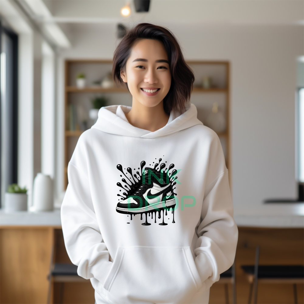 Jordan 1 Style Drip Hoodie, Iconic Black White Sneaker Art, Urban Streetwear Apparel, Abstract Ink Splash Design, Trendy Shoe Graphic Hoodie