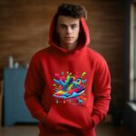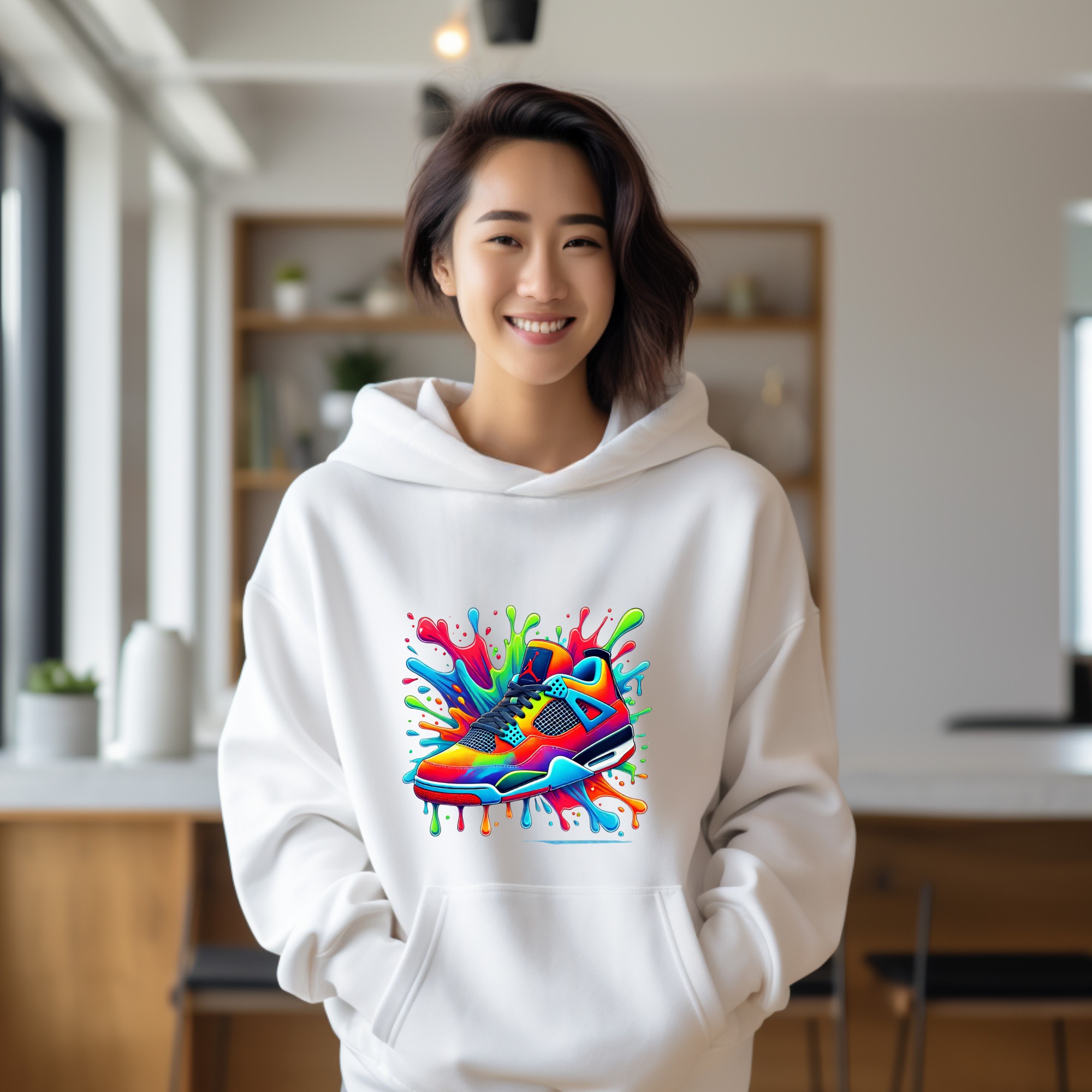 Vibrant Paint Splash Sneaker Hoodie, Colorful Urban Streetwear, Abstract Art Shoe Design, Unique Hip Hop Fashion, Cool Athletic Hoodie