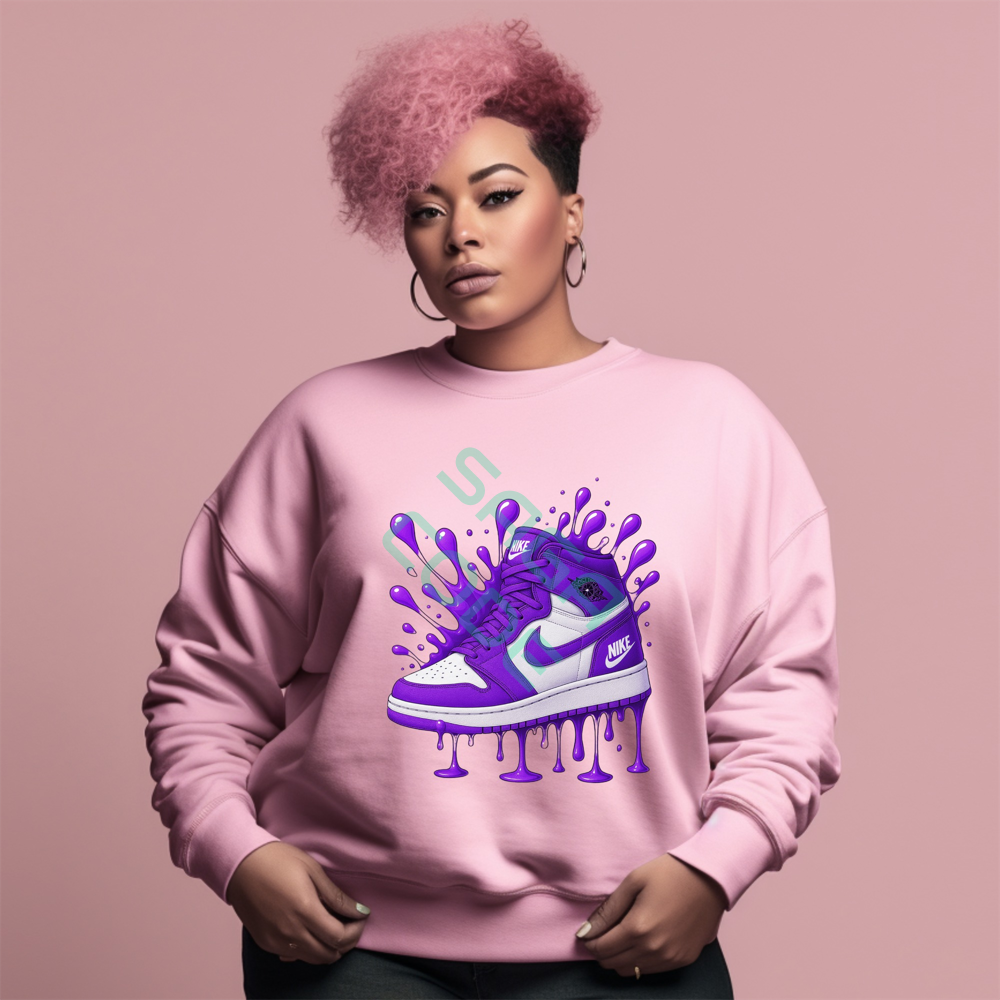 Hypebeast Purple Drip Sneaker Sweatshirt, Urban Style High-Top Shoe Art, Jordan 1 Inspired Graphic Apparel, Unique Artistic Design Pullover