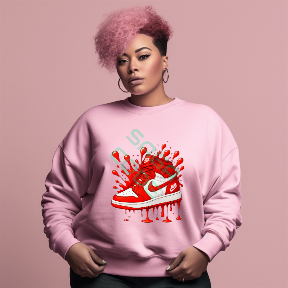 Red White Dripping Sneaker Sweatshirt, Iconic Basketball Shoe Art, Urban Streetwear Graphic Top, Trendy Jordan Inspired Apparel, Vibrant